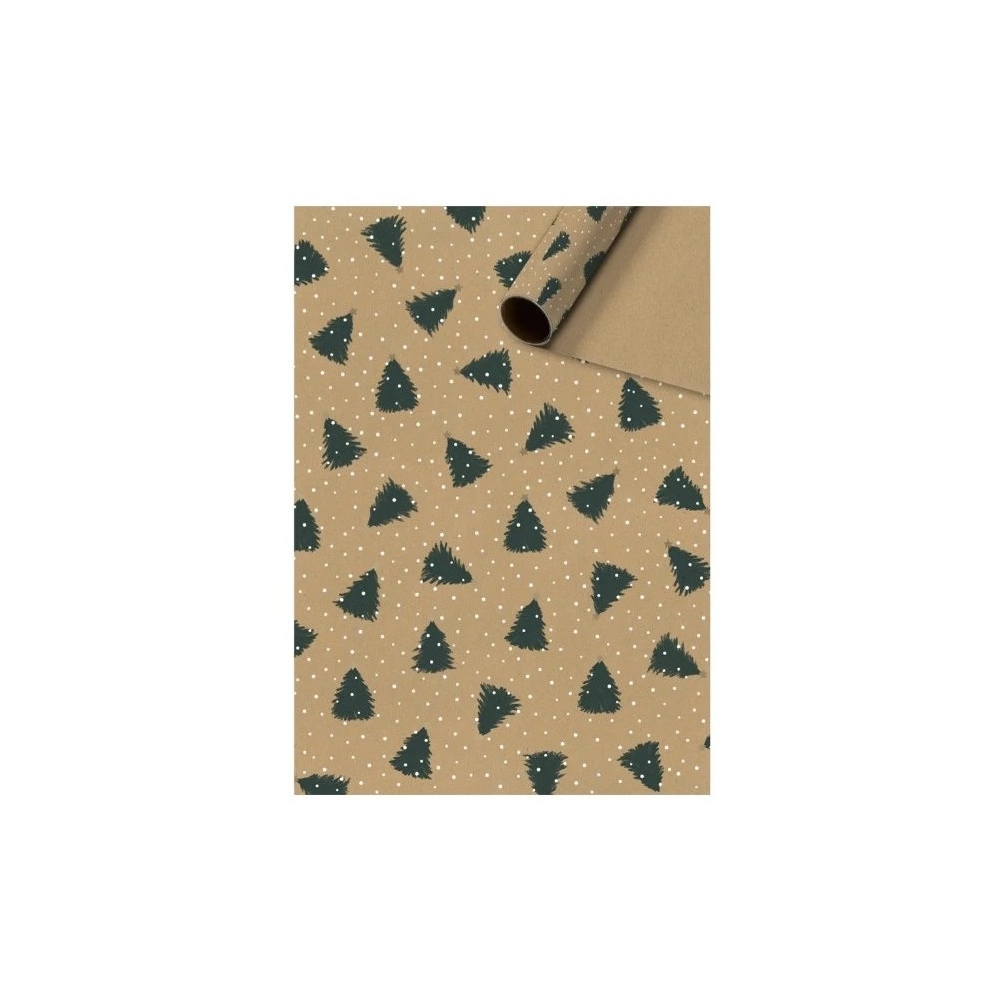 Přírodní vánoční papír v hnědém kraftovém stylu s tmavě zelenými stromečky
