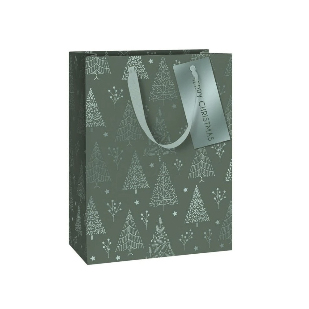 Vánoční dárková taška v zeleném odstínu s motivem jemných stromků. Elegantní a zároveň přírodní design dodá Vašim dárkům sváteční atmosféru. Je ideální pro snadné a stylové balení bez nutnosti papíru a stuh.