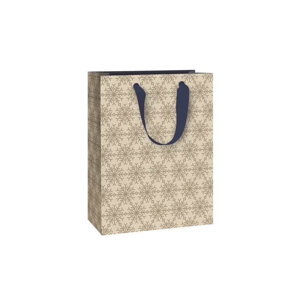 Vánoční dárková taška v elegantním odstínu s motivem vloček. Design dodá Vašim dárkům sváteční atmosféru. Je ideální pro snadné a stylové balení bez nutnosti papíru a stuh.