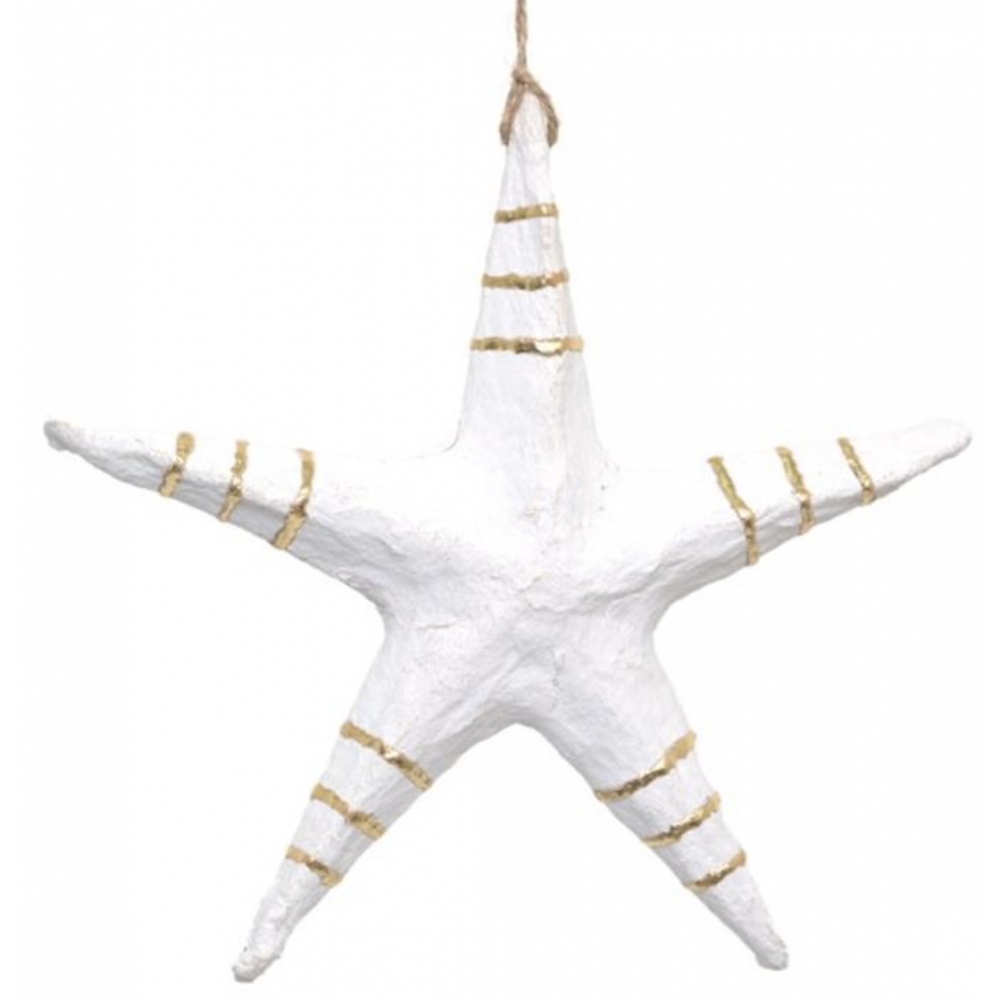 Závěsná hvězda z cotton-maché zdobená zlatými tenkými linkami.