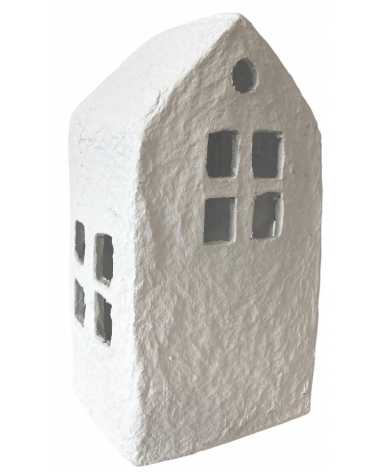 Bílý jemný domeček z cotton-maché pro vánoční dekoraci. Střecha je zdobena zlatými hvězdičkami.