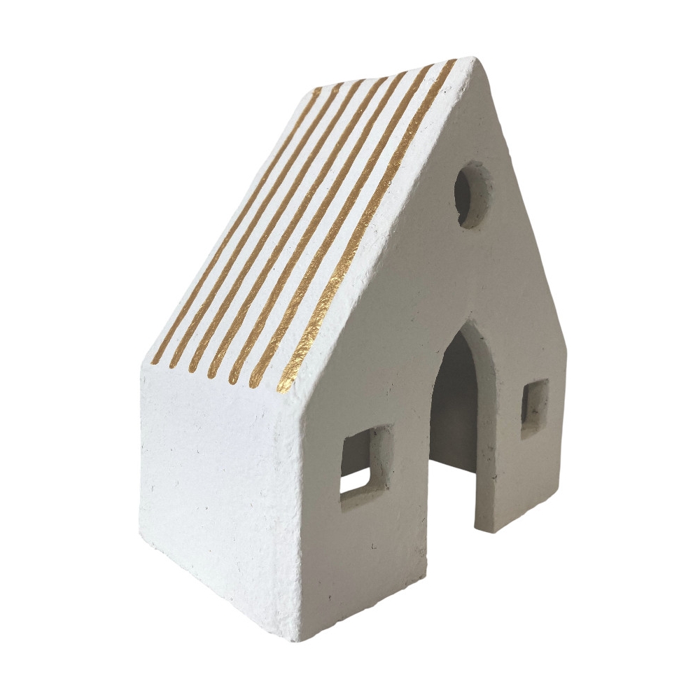 Bílý jemný domeček z cotton-maché pro vánoční dekoraci. Střecha je zdobena tenkými zlatými proužky.