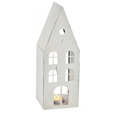 Kovový bílý domeček s patinou na čajovou svíčku.