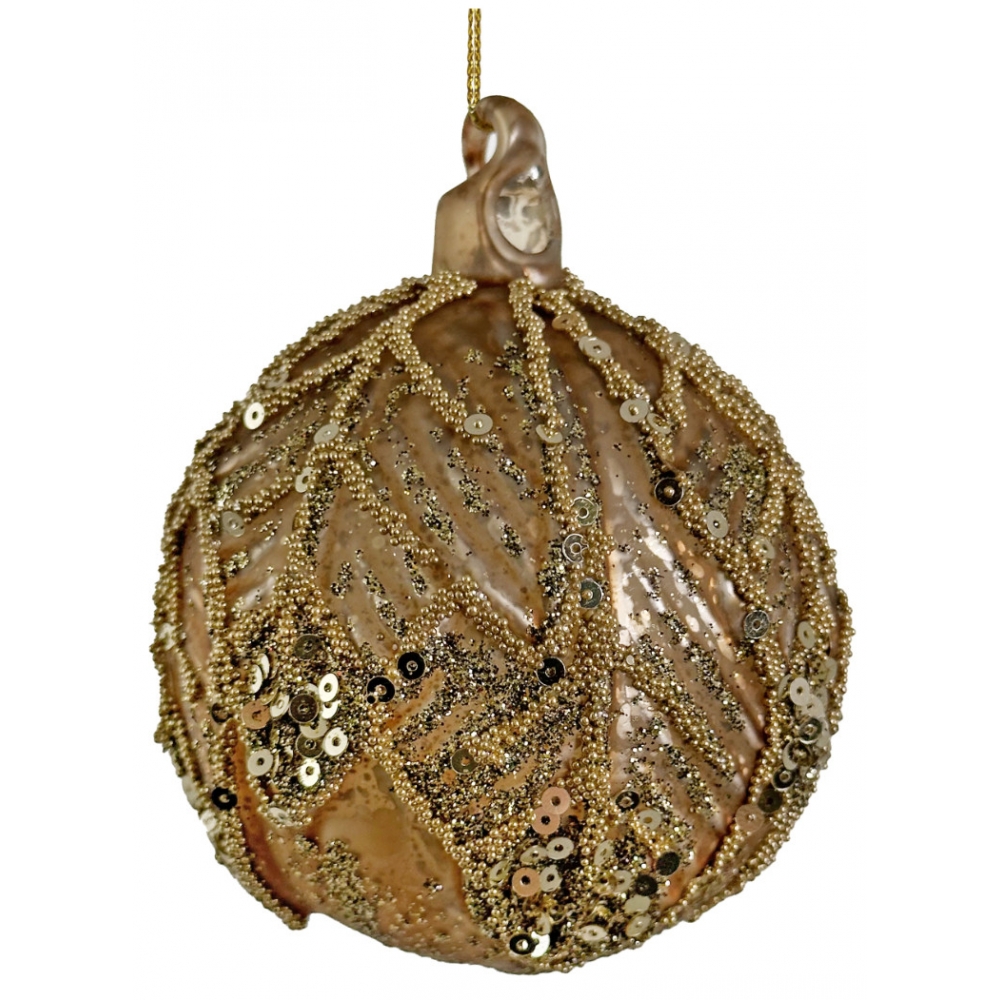 Skleněná vánoční ozdoba v odstínu zlaté antique je zdobena dekorem listů a doplněná jemnými korálky.