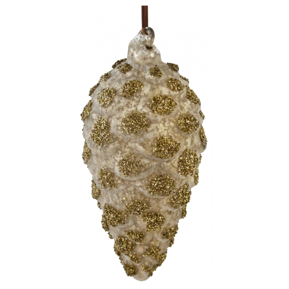 Skleněná šiška v hnědém odstínu antique s jemným ledovým efektem. Povrch je zdoben zlatými třpytkami, které dodávají ozdobě luxusní a slavnostní vzhled. Je ideálním doplňkem pro stylovou vánoční výzdobu.