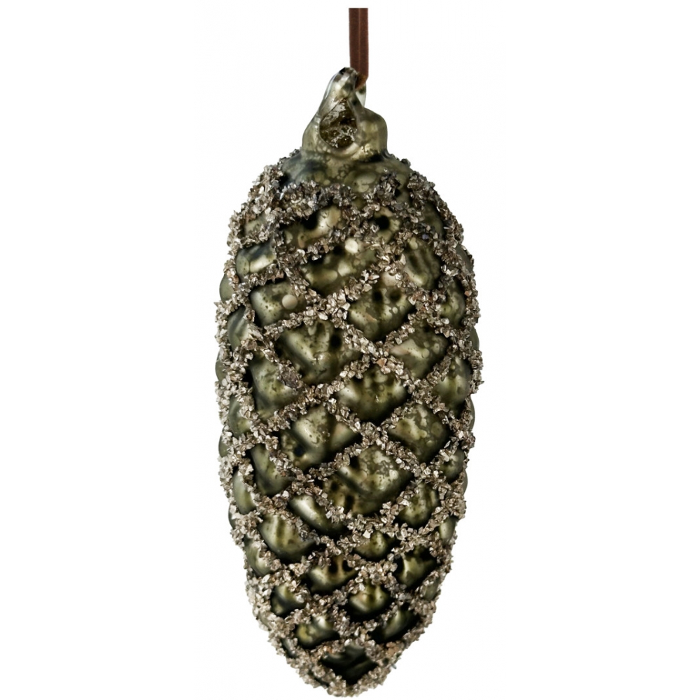 Skleněná vánoční ozdoba ve tvaru šišky v zeleném odstínu antique. Povrch je zdoben jemnými třpytkami, které jí dodávají slavnostní a elegantní vzhled. Je ideální na vánoční stromeček a do dekorativních aranžmá.