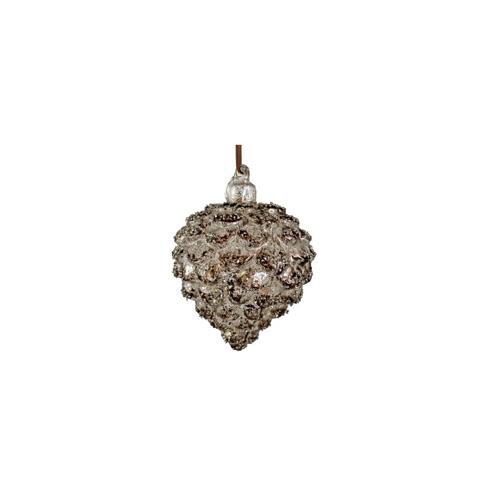 Skleněná vánoční ozdoba ve tvaru šišky v elegantním stříbrném odstínu antique. Povrch je jemně třpytivý, což dodává ozdobě slavnostní lesk a luxusní nádech. Stylový doplněk, který krásně vynikne na vánočním stromku i v kombinaci s dalšími dekoracemi.