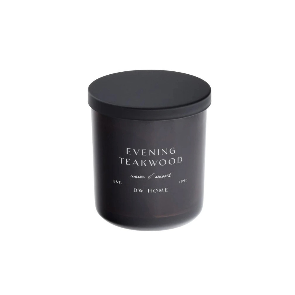 Vonná Svíčka Evening Teakwoodsvou s hřejivou vůní mahagonu, citrusově svěží levandule a pepřence s jemností teakového dřeva.