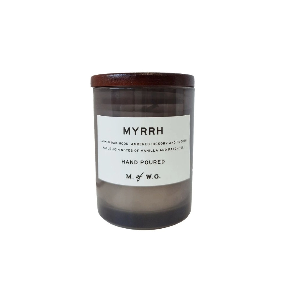 Sójová svíčka Myrrh mísí smyslnou vůni myrhy s kouřovým dubovým dřevem, bílým ořechem a jemnými tóny javoru. Krémová vanilka a zemitá pačule dodávají kompozici hřejivý a podmanivý charakter, který vytvoří klidnou atmosféru ve Vašem domově.